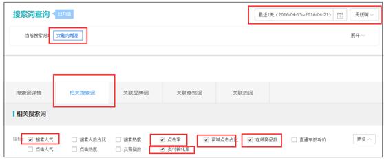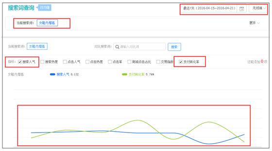 因为每次只能选择两个指标看,你可以多看一些数据,点击率、商城点击占比(如果你是C店的话,更应该看)。如果你发现有两个以上的词都可以代表你产品的核心属性,那么就多看几个,比较一下,然后最终去敲定你的聚焦关键词。
