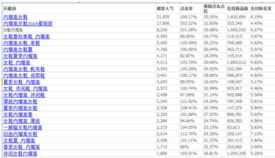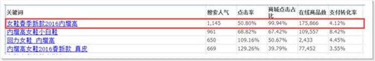 如果你是一个C店,你看红框里面的这个词:女鞋春季新款2016内增高,99.94%都被商城点走了,这个词再好,也是不适合你的,0.06%得机会,哪有那么容易就是你的。