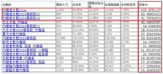 如果在确保前面的流程都走完了,也就是说假设剩下的都是高度相关的词的话,计算完竞争力,从大到小排序后,排在前面的词就是最好的词。也就是说第一好词:内增高女鞋10CM。